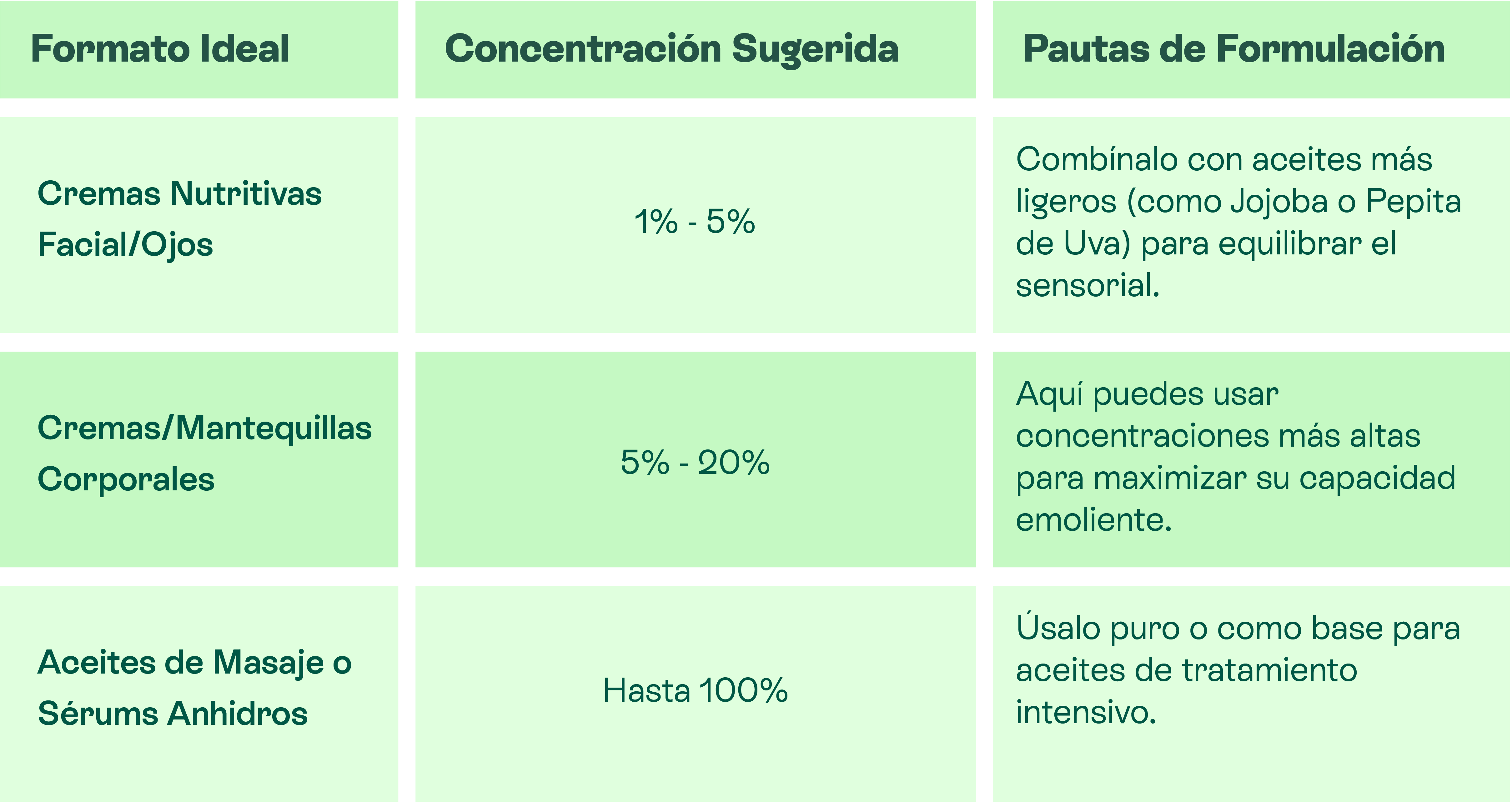 Dado su perfil denso y rico, es importante saber cómo dosificar y en qué tipo de fórmulas brilla más el Aceite de Aguacate: