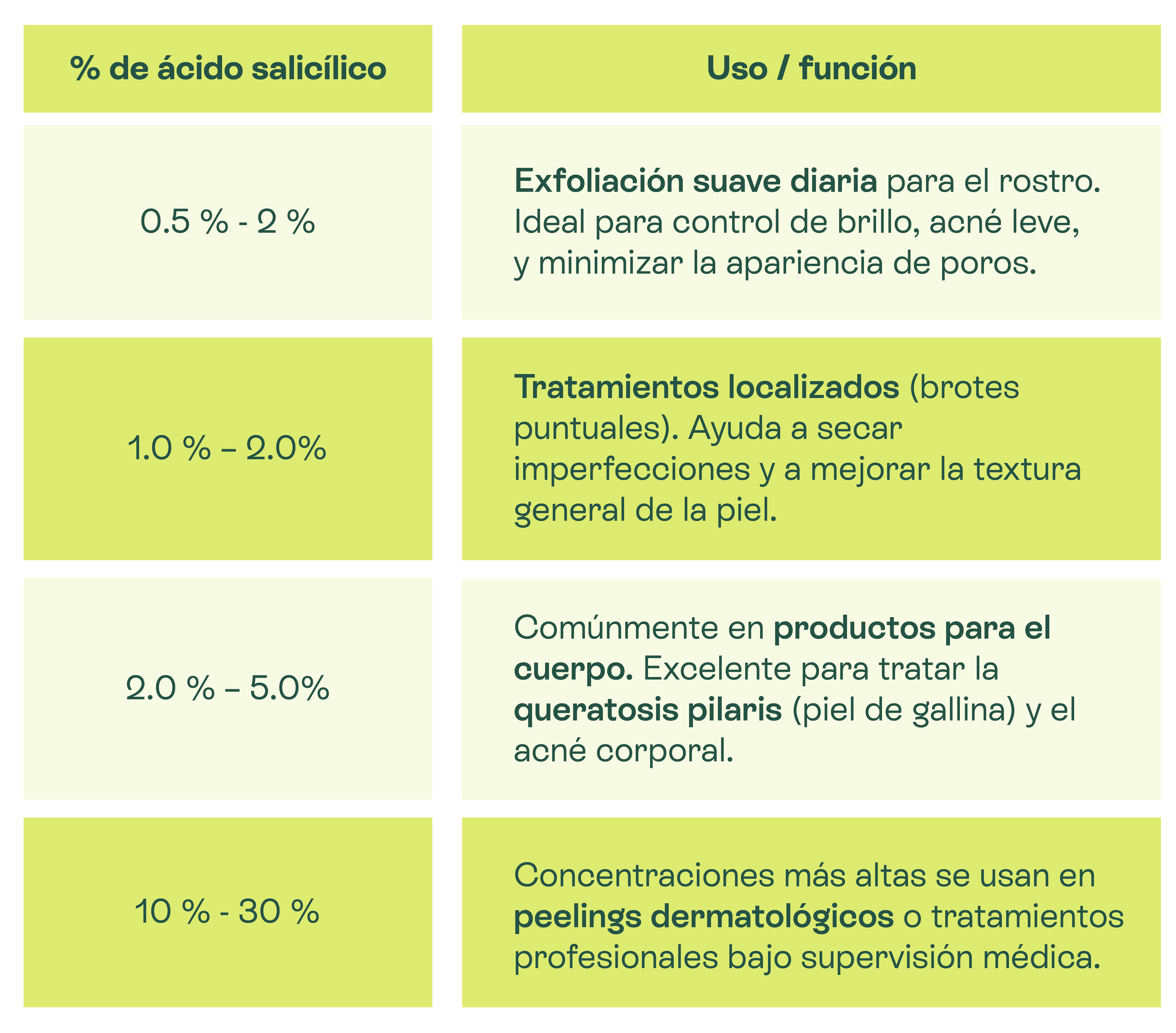 Aunque es famoso por su poder anti-acné, el ácido salicílico es mucho más versátil de lo que imaginas. Dependiendo de su concentración, puede ser un aliado fantástico para: