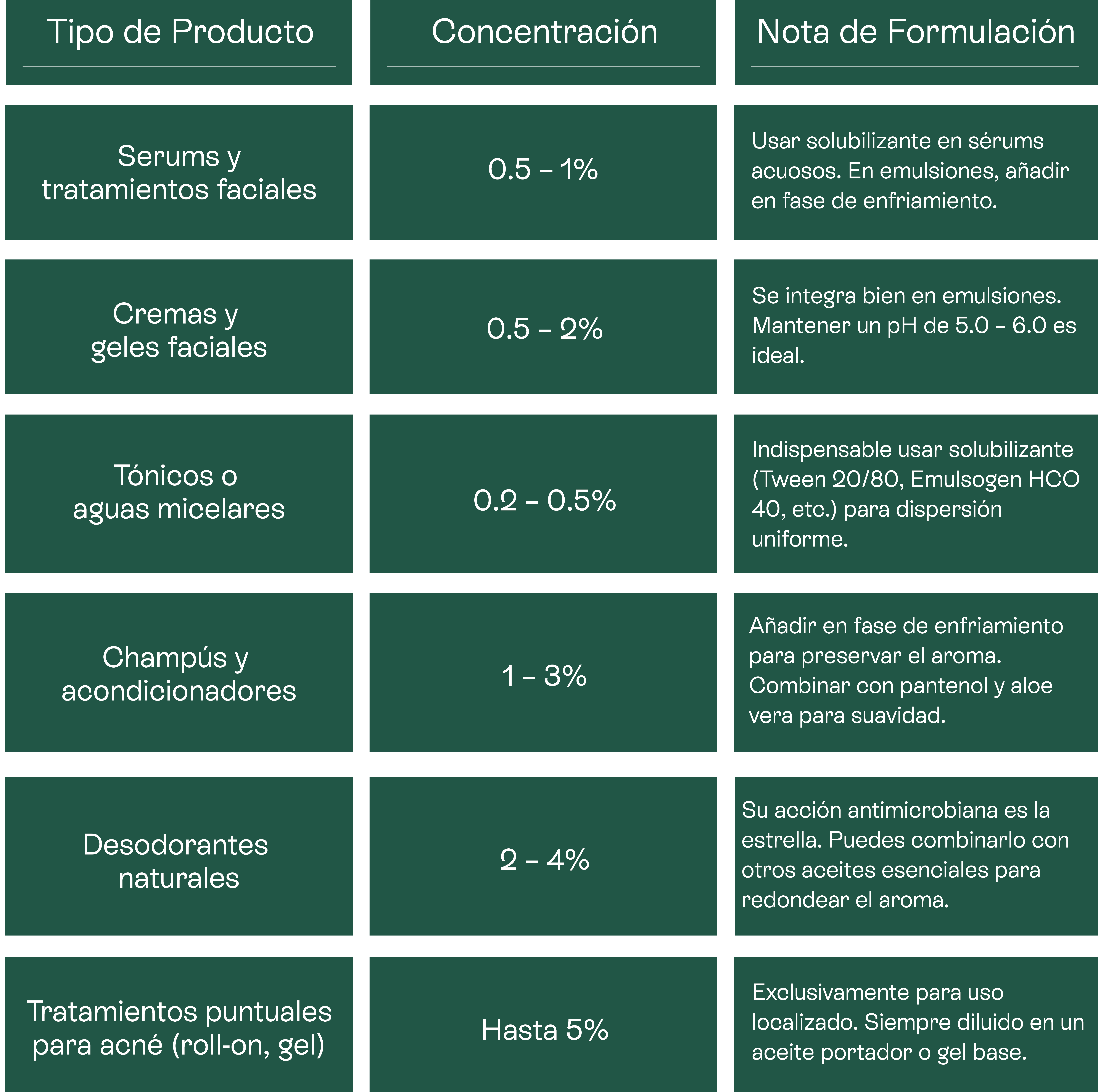 El aceite esencial de árbol de té es un activo extraordinario, un pilar de la cosmética natural purificante. Su poder no debe ser temido, sino respetado y entendido. Con la dosis correcta, la técnica de incorporación adecuada y las precauciones de seguridad, se convierte en una herramienta de precisión en tu arsenal de formulador.