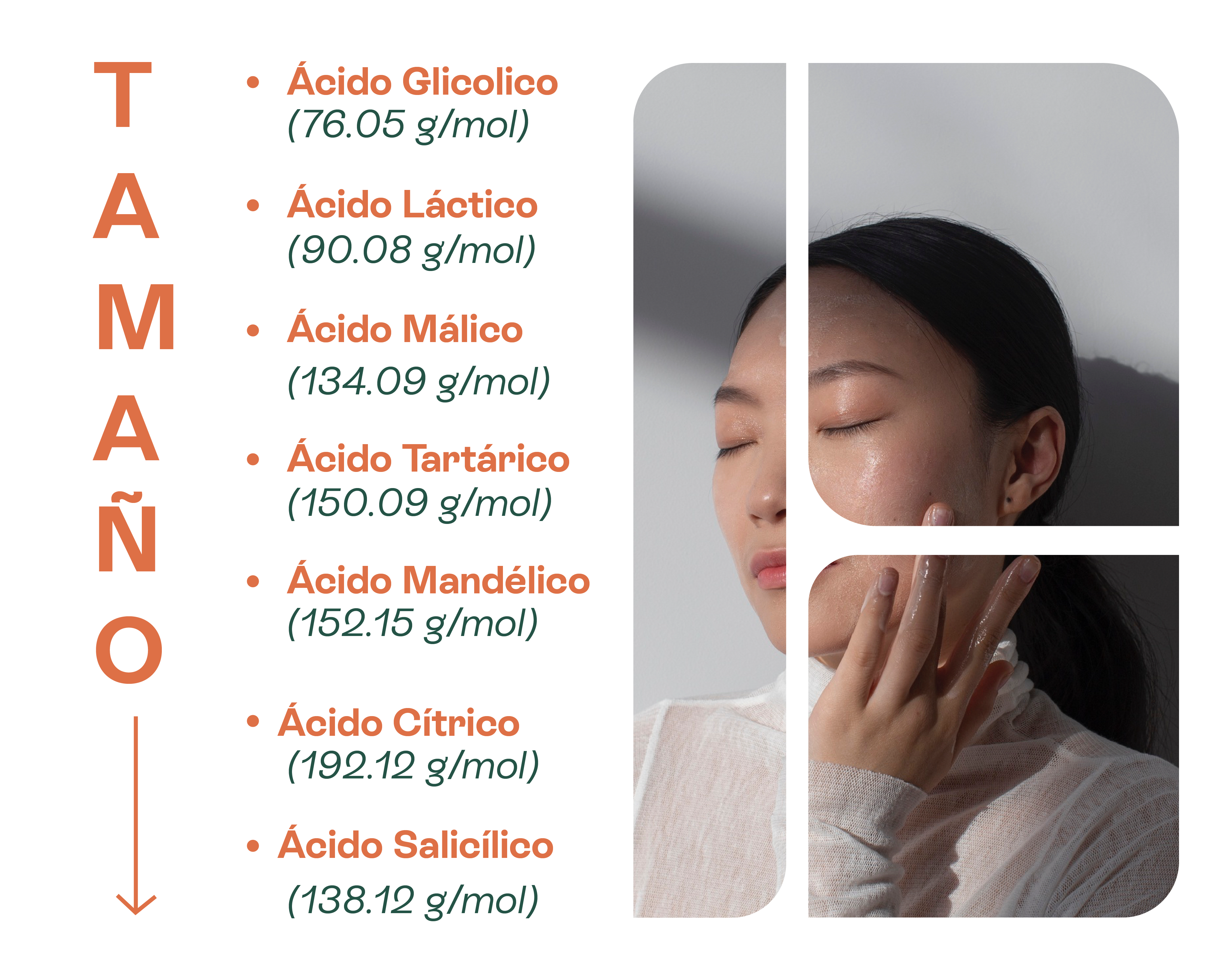 Pero esto no termina aquí. Hay distintos tipos de AHA, y cada uno con un tamaño diferente. ¿Cómo afecta esto a tu piel? Pues, entre más pequeño sea el AHA, más profundo logrará penetrar en las capas de la piel y sus efectos serán más potentes y notorios. Sin embargo, no todo es color de rosa: un tamaño menor también implica un mayor potencial de irritación, por lo que deben usarse con mucha precaución.