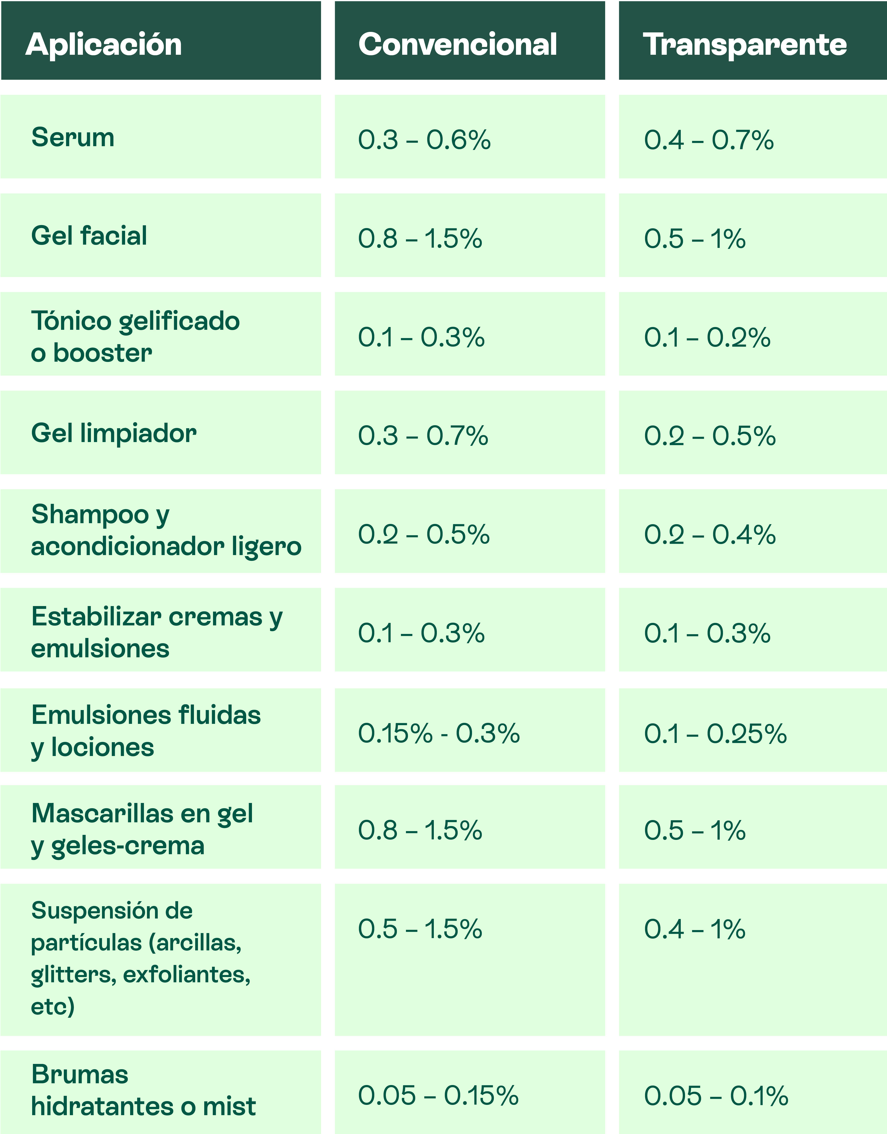 Te recomendamos añadirla en estas concentraciones según el formato que desees: