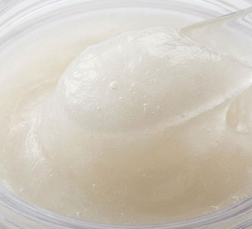 ✧ Xantana Convencional: Contiene impurezas naturales residuales (pigmentos y subproductos de la fermentación). Esto genera geles opacos, turbios o ligeramente lechosos. Su textura puede sentirse más "gomosa" o fibrosa.