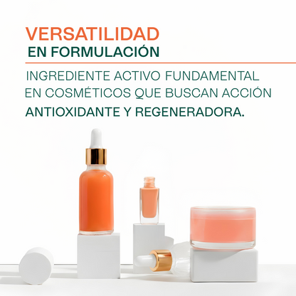 Es un ingrediente activo fundamental en cosméticos que buscan una acción antioxidante y regeneradora. Se sinergiza de manera excelente con otros aceites y activos para crear formulaciones complejas, como tratamientos intensivos, cremas aclarantes y lociones.