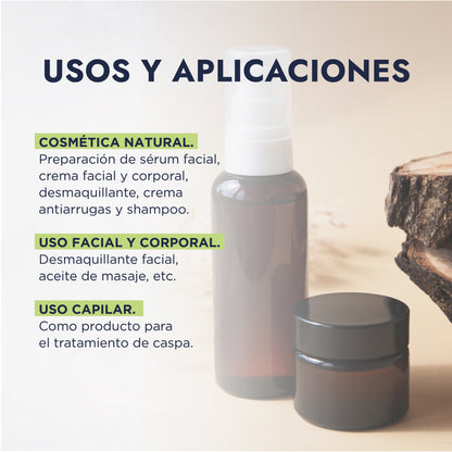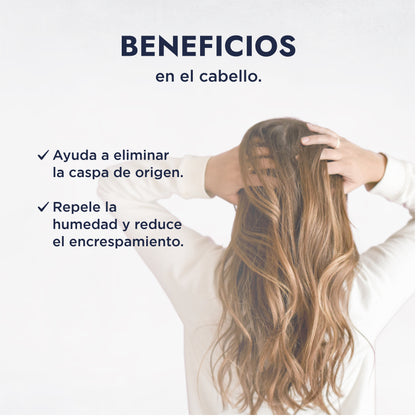Este aceite beneficia al cabello y al cuero cabelludo al regular la producción de sebo y aliviar irritaciones. Sus propiedades antimicrobianas lo convierten en un ingrediente eficaz para champús anticaspa. Nutre el cabello profundamente, haciéndolo lucir más saludable y con un brillo natural.