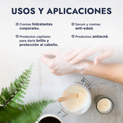 • Base Estable en Cosméticos: Su estabilidad (incluso en frío) y propiedades lo hacen ideal para incluir en formulaciones de cremas, lociones, champús, acondicionadores y bálsamos labiales.