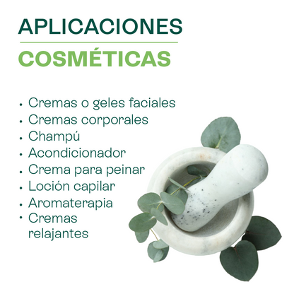 • Purificación y Antiséptico: El eucaliptol no solo ayuda a purificar las vías respiratorias, sino que también tiene una acción antiséptica. Esto lo hace ideal para purificar el ambiente en difusores, y en formulaciones cosméticas ayuda a limpiar la piel, especialmente en productos para el cuidado de los pies o para pieles congestionadas.