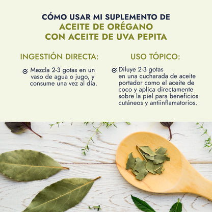 ¿Sabías que la combinación de Aceite de Orégano y Uva Pepita es una forma segura de aprovechar el poder del orégano? La uva pepita, rica en omega-6, actúa como un aceite portador que reduce el riesgo de irritación, lo que te permite aprovechar al máximo los beneficios del aceite de orégano de manera más segura.