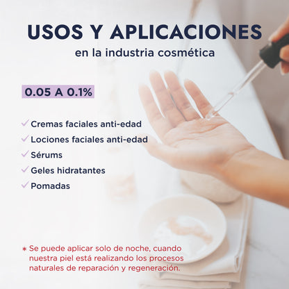 • Cremas y Lociones Antiarrugas: Para el tratamiento del fotoenvejecimiento, se incorpora en emulsiones más ricas que contienen Ceramidas, Pantenol y Ácido Hialurónico. Estos ingredientes sinérgicos ayudan a mitigar la dermatitis por retinoides (sequedad y descamación) causada por el activo.