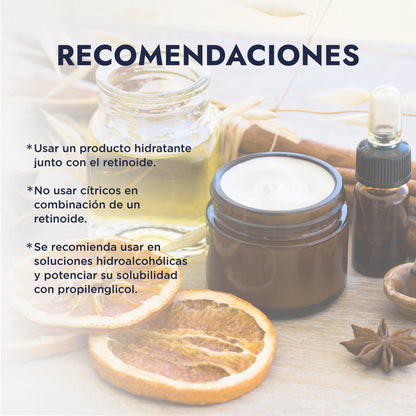 El Ácido Retinoico (Tretinoína) es la forma ácida y más potente de la Vitamina A. Actúa como un agente de comunicación celular que reprograma la función cutánea, siendo el "gold standard" en dermatología. Es altamente eficaz contra el fotoenvejecimiento y el acné severo, ya que acelera la renovación celular y estimula el colágeno. Se presenta como un polvo amarillo, insoluble en agua, y su uso está estrictamente reservado a supervisión médica debido a su alta potencia e irritación.