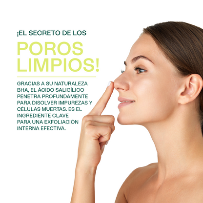 ¿Sabías que... el Ácido Salicílico es el único ácido exfoliante que es liposoluble (soluble en aceite), lo que le permite disolver el sebo y la queratina para limpiar los poros desde el interior, haciéndolo el mejor activo contra los puntos negros y espinillas?