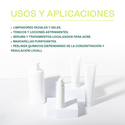 • Sérums y Gels Purificantes: Se formula en bases de glicoles o soluciones hidroalcohólicas para crear sérums de alta penetración y rápida absorción, que son altamente compatibles con otros activos antiacné como la Niacinamida y el Zinc PCA (con los que es sinérgico).