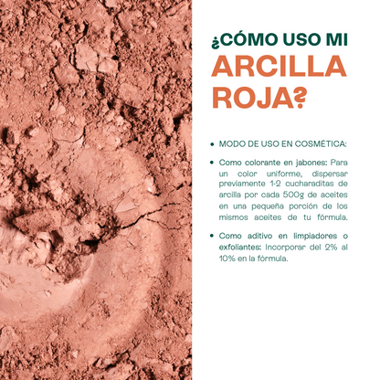 Este mineral es químicamente estable en un amplio rango de pH (3−11) y no requiere un proceso de conservación complejo por sí mismo. Es importante notar que la Arcilla Roja es totalmente insoluble en agua y aceites; funciona al ser dispersada en un líquido para formar una suspensión o pasta. Esta característica la hace un ingrediente base excelente para mascarillas en polvo (hasta 70% de la fórmula), exfoliantes, y como un colorante natural estable para jabones y otros productos cosméticos que no se degradan con la luz o el tiempo.