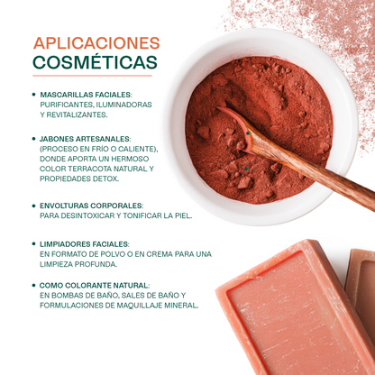 Su perfil mineral es rico en óxidos de hierro (el responsable de su pigmentación) y otros oligoelementos esenciales para la piel. Su acción es doble: por un lado, es absorbente y adsorbente, atrayendo y fijando impurezas, toxinas y el exceso de grasa. Por otro lado, la alta carga de hierro confiere un efecto tónico y estimulante que favorece la regeneración celular y la circulación linfática. Esto se traduce en un efecto descongestionante y un tono de piel más uniforme y saludable. A pesar de su acción depurativa, es considerada más suave y menos astringente que la arcilla verde, siendo adecuada para pieles normales, mixtas o incluso sensibles que necesitan activación.