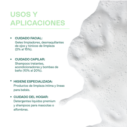 Es un excepcional modificador de la espuma. En lugar de generar burbujas grandes y que se disipan rápidamente, transforma la espuma en una textura más compacta, lujosa y cremosa, mejorando la experiencia sensorial del lavado.