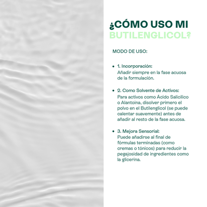 Mejora la Sensorialidad: En cremas y lociones (en dosis de 1.0% a 5.0%), combínalo con Glicerina. El Butilenglicol contrarresta la sensación pegajosa, resultando en un producto final altamente hidratante pero con un tacto elegante.