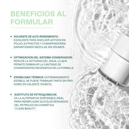 Alternativa Sostenible al Propilenglicol: Siendo de origen vegetal, es el reemplazo directo del Propilenglicol (derivado del petróleo) en cualquier formulación, permitiendo obtener una certificación clean beauty o una declaración de origen 100% natural sin sacrificar el rendimiento.