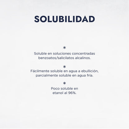 Solubilidad: Soluble en agua caliente (solubilidad limitada en frío)