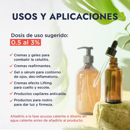 • Geles y Cremas Reductoras: Formula en concentraciones de 1.0%−3.0% para crear geles corporales. Aplica con un masaje vigoroso en muslos y caderas para promover el drenaje y la movilización de grasas.