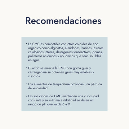 • Incompatibilidades: Al tener una carga aniónica, la CMC puede ser sensible a sales a alta concentración (electrolitos) y a ingredientes fuertemente catiónicos. También pierde viscosidad en presencia de altas concentraciones de alcohol (más del 15.0%−20.0%).