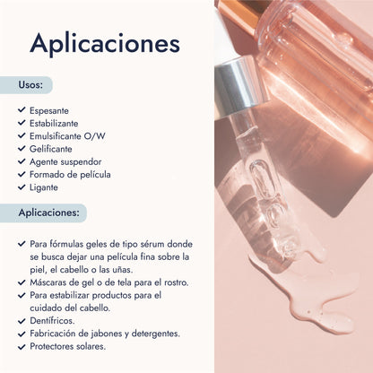 • Sérums Hidratantes: Base ideal para crear geles acuosos transparentes que actúan como vehículos para activos hidrosolubles (como niacinamida o pantenol), proporcionando una sensación de frescura y ligereza.