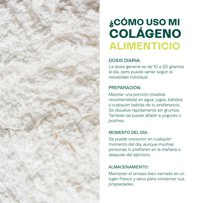 Dado que es un producto de grado alimenticio, su uso está enfocado en la ingesta oral como suplemento nutricional. No se recomienda su uso en formulaciones cosméticas tópicas, ya que su peso molecular hidrolizado está optimizado para la absorción sistémica y no para la acción superficial en la piel. Su beneficio es nutrir y reparar desde el interior.
