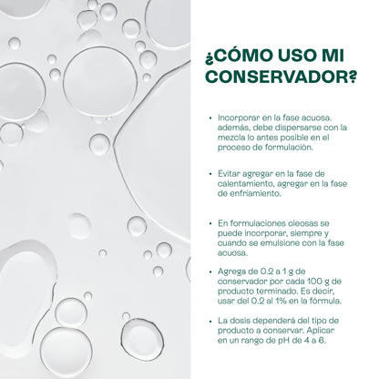 • Para Geles Acuosos: Es el conservador ideal para geles faciales y corporales. Al ser soluble en agua, se disuelve fácilmente y proporciona una protección transparente sin afectar la viscosidad o la textura del gel.