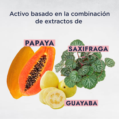 La combinación de extractos de papaya, guayaba y saxifraga le confiere propiedades únicas. La papaya actúa como un exfoliante enzimático suave, mejorando la textura de la piel. La guayaba es rica en antioxidantes y vitaminas que protegen la piel del daño ambiental. La saxifraga es conocida por sus propiedades aclarantes y antiinflamatorias. Juntos, estos extractos trabajan para reducir la producción de melanina, desvanecer manchas existentes y prevenir la aparición de nuevas, logrando un tono de piel más uniforme.