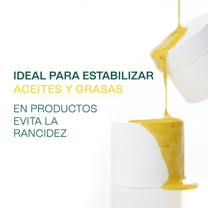 Su función principal es la de prevenir la oxidación y el enranciamiento de los aceites y mantecas en los productos cosméticos. Al evitar esta degradación, se prolonga la vida útil de la formulación y se asegura que sus propiedades y beneficios se mantengan intactos por más tiempo.
