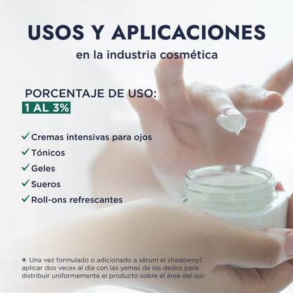 Shadownyl es una solución acuosa estable en un rango de pH ligeramente ácido a neutro (4.0 a 7.0). Al ser un extracto biotecnológico, es sensible al calor: su eficacia se mantiene cuando se incorpora a la fórmula a una temperatura máxima de 40 °C. Se utiliza en una concentración de 1.0% a 3.0% y es compatible con otros activos clave como la Vitamina C y el Ácido Hialurónico, permitiendo la formulación de tratamientos completos para el contorno de ojos.