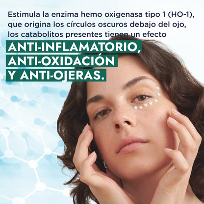 El activo contiene un extracto acuoso de Fucus vesiculosus, un alga rica en compuestos bioactivos. Su propiedad más única es su capacidad para inhibir la enzima hemo oxigenasa-1 (HO-1). Esta enzima está implicada en la degradación de hemoglobina de los capilares rotos, la cual es la causante directa del color azulado/violáceo de las ojeras vasculares. Además, sus polisacáridos actúan como agentes antioxidantes y antiinflamatorios que protegen y calman la zona. Todo esto se entrega en una base hidrosoluble con un pH compatible con la piel, que facilita su uso.