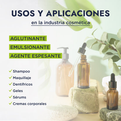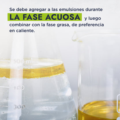 • Cremas, Lociones y Emulsiones (0.1%−0.3%): Incorpórala a dosis bajas en la fase acuosa de las emulsiones para incrementar la viscosidad de esa fase y evitar la coalescencia (unión de gotas de aceite), estabilizando la crema.