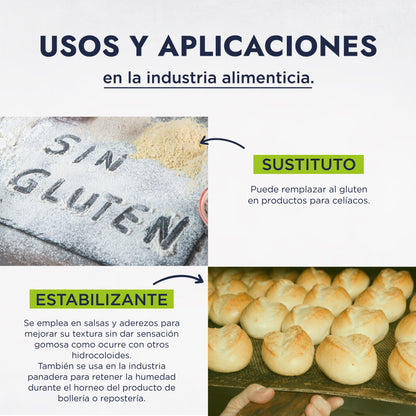 • Mejora del Mouthfeel y la Textura (Alimentos): En aplicaciones alimentarias, aporta una sensación cremosa y rica en la boca, y actúa como agente aglutinante para imitar la estructura del gluten en la panadería sin gluten.