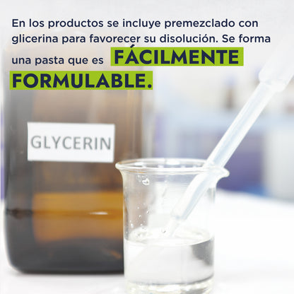 • Dispersión Óptima: Para lograr una hidratación rápida y sin grumos, siempre se recomienda dispersar el polvo en glicerina o propanodiol (humectante líquido) hasta formar una pasta. Esta pasta se añade con agitación a la fase acuosa. También se puede dispersar en caliente (70 °C), lo que acelera el proceso.