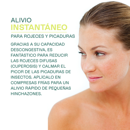 • Compresas calmantes: Humedece un disco de algodón con el hidrolato y aplícalo sobre zonas enrojecidas o irritadas para un efecto calmante y descongestivo.