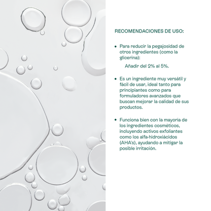 • Mejora de Fórmulas: Se sinergiza de manera excelente con la Glicerina y el Ácido Hialurónico. Al combinarlo con glicerina, permite al formulador alcanzar un nivel de humectación extremo sin que la fórmula adquiera una sensación desagradablemente pegajosa, balanceando así la sensorialidad.