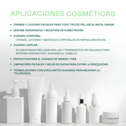 • Lociones y Cremas Ligeras: Incorpóralo (1.0%−10.0%) en lociones y cremas faciales o corporales para potenciar la hidratación y contrarrestar la sensación pesada o grasa de los emolientes.