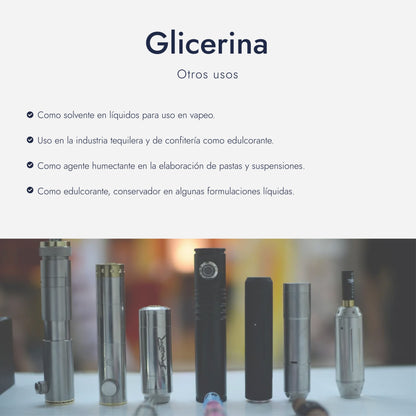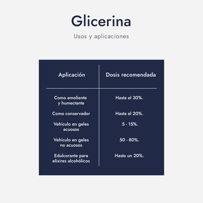 • Geles y Bases Gelificadas: Se utilizan para prevenir la deshidratación del gel y mejorar la transparencia y claridad visual de la fórmula. La Glicerina ayuda a que los geles no se sientan pegajosos si se formula correctamente.