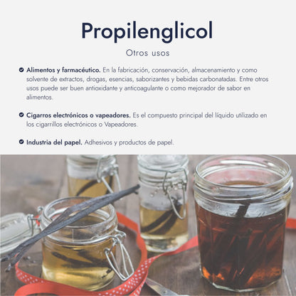 • Vehículo de Sabor y Color: El Propilenglicol es un solvente de grado alimenticio perfecto para disolver esencias y colorantes antes de agregarlos a productos de repostería o bebidas, garantizando una distribución uniforme del aroma y el color.
