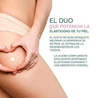 El Aceite de Rosa Mosqueta es indispensable para mejorar la apariencia de estrías (especialmente las rojas) y cicatrices (de acné, quirúrgicas) al estimular la regeneración de los tejidos. La Jojoba complementa esta acción aportando una elasticidad duradera y una absorción cómoda que facilita el masaje en grandes zonas sin sensación pesada.