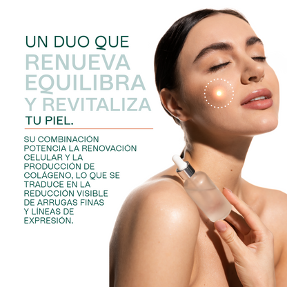 La combinación potencia la renovación celular y la producción de colágeno, lo que se traduce en la reducción visible de arrugas finas y líneas de expresión. El uso combinado ayuda a unificar el tono y atenuar manchas por su efecto renovador. La Jojoba equilibra la piel, controlando el sebo en la zona T, mientras que la Mosqueta nutre y repara las zonas secas, ideal para pieles mixtas y maduras.