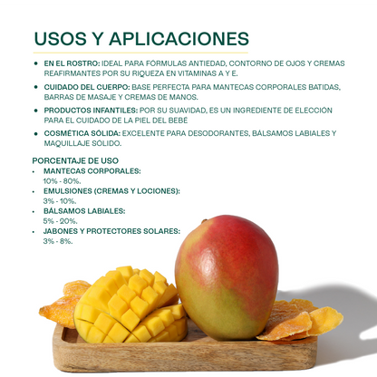 La Manteca de Mango (Mangifera Indica Seed Butter) es una grasa vegetal semisólida, extraída del hueso del mango, altamente valorada en cosmética por su textura suntuosa, no pegajosa y su elegante absorción. Su perfil equilibrado de ácidos grasos (Esteárico y Oleico) junto a una rica fracción insaponificable (fitoesteroles y antioxidantes) le confiere excelentes propiedades emolientes y regeneradoras. Posee un punto de fusión bajo (31 °C−39 °C), derritiéndose al contacto con la piel para formar una barrera protectora que nutre y previene la pérdida de humedad. A diferencia de otras mantecas, ofrece una hidratación profunda sin dejar sensación pesada, siendo ideal para mantecas corporales batidas, bálsamos labiales y acondicionamiento capilar ligero.