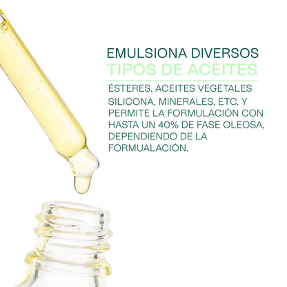 Es notablemente resistente a variaciones químicas, funcionando de manera estable en un rango de pH excepcionalmente amplio (3 a 12). Esta estabilidad al pH lo hace compatible con una gran variedad de activos cosméticos, desde ácidos suaves hasta bases. Es no comedogénico (Grado 0) y su uso se recomienda en sinergia con gomas o polímeros para optimizar aún más la viscosidad y la sensorialidad final de la emulsión.