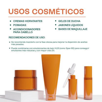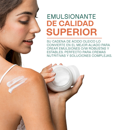 Permite la formulación de lociones corporales y cremas fluidas con una sensación agradable, no pesada. Actúa como el puente perfecto entre aceites vegetales y agua, proporcionando emulsiones homogéneas y duraderas con un tacto suave y fácil de extender.
