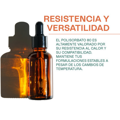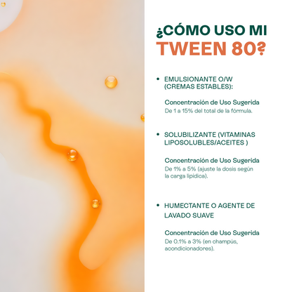 • Sérums Acuosos con Vitaminas: Solubiliza Vitamina E o aceites faciales livianos en tu base de agua/hidrolato usando una ratio apropiada de Polisorbato 80, creando un serum acuoso que aporta nutrición sin tacto oleoso.
