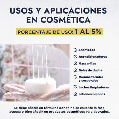 • Champús y Jabones Líquidos: Se añade para mitigar la posible resequedad de los tensioactivos, dejando el cabello o la piel con una sensación acondicionada después del enjuague.